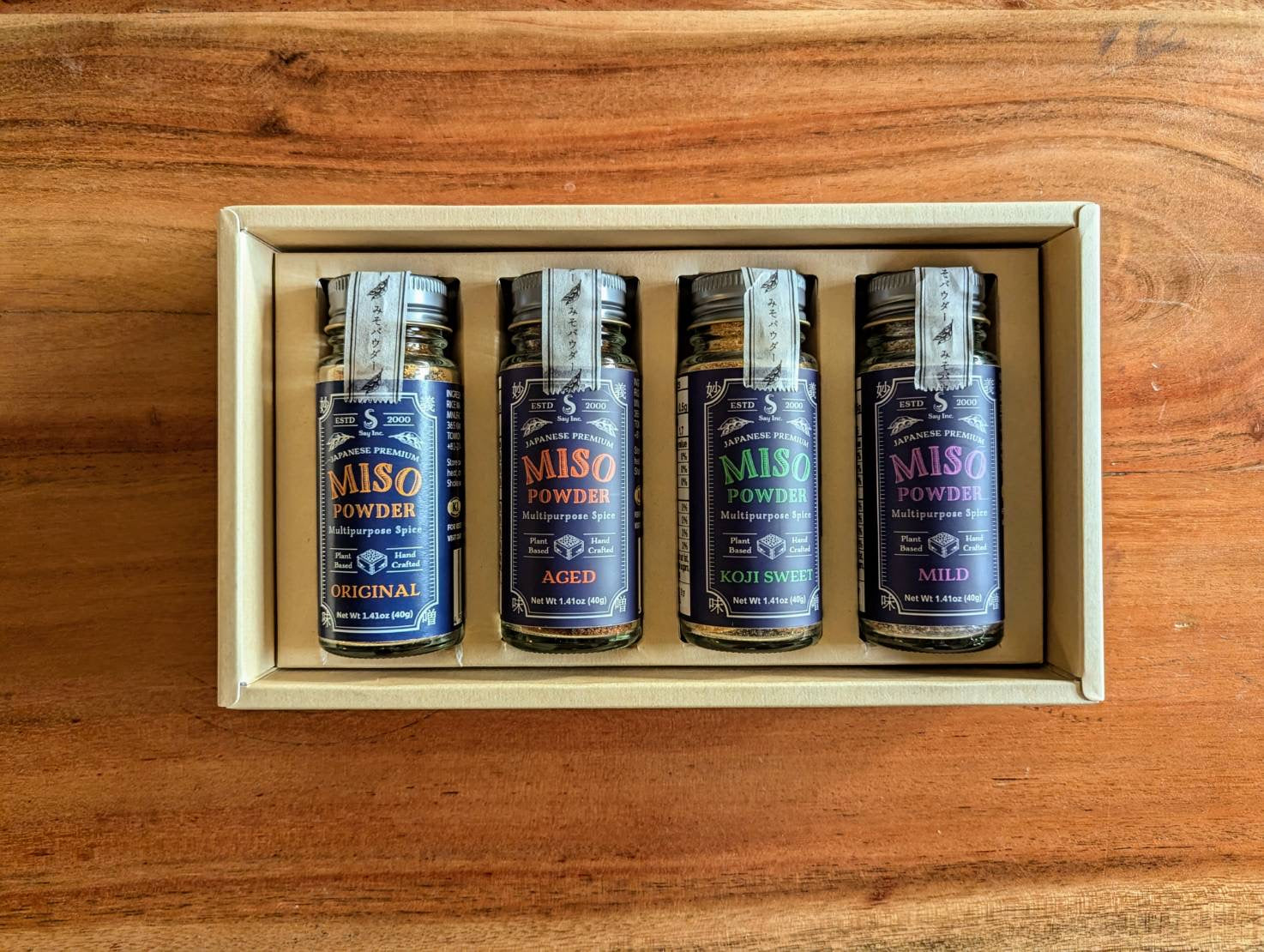 Introducing the Furifuru Miso Powder Gift Box, a delightful selection perfect for gifting or treating yourself! This gift set includes four unique varieties of premium miso powder: Fresh, Aged, Organic Double Koji, and Hanamame (Flower Bean) miso. Each variety offers a rich umami and depth of flavor that enhances any meal.